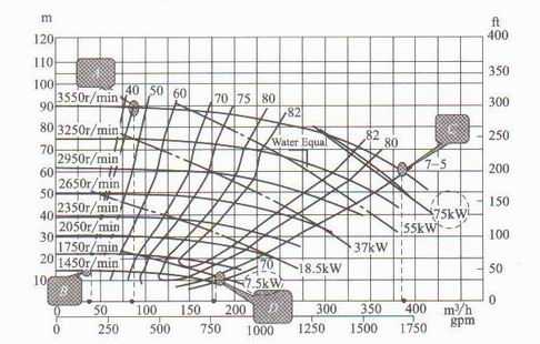 在變轉(zhuǎn)速下泵的最小流量限制是有眾多不同速度下的自吸泵的性能曲線上左側(cè)的最小流量限制點(diǎn)所形成的一條最小流量限制線(由A、B 兩點(diǎn)連成的線),如圖1所示。在變轉(zhuǎn)速下泵的最大流量限制是由眾多不同轉(zhuǎn)速下的自吸泵性能曲線上最右端的限制點(diǎn)所形成的一條限制線(如由C 、D兩點(diǎn)連成的線)。